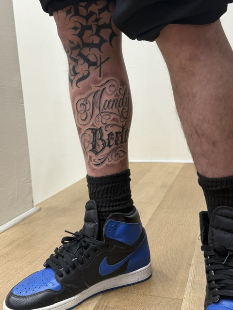 My journey into tattooing began with a deep passion for custom lettering. As a young artist, Mister Cartoon's work ignited my creativity and his original style remains my greatest inspiration. A few years into drawing letters, I booked a tattoo appointment with him with the sole intention of seeking any opportunity to work under his guidance. In a fortunate turn of events, that day led to full-time employment and eventually, after three years, an apprenticeship in his private studio. This experience provided invaluable insight into the operation of a high-level tattoo shop and exposure to a diverse clientele, including numerous celebrities. Mister Cartoon emphasized exceptional client experience for everyone, from high-profile individuals like Kobe Bryant, Travis Scott, Justin Timberlake, Beyoncé, and Eminem, to anyone investing in custom artwork. Now, several years after receiving his endorsement, I am a full-time tattooer committed to upholding his belief in my potential and prioritizing an excellent experience for my own clients.